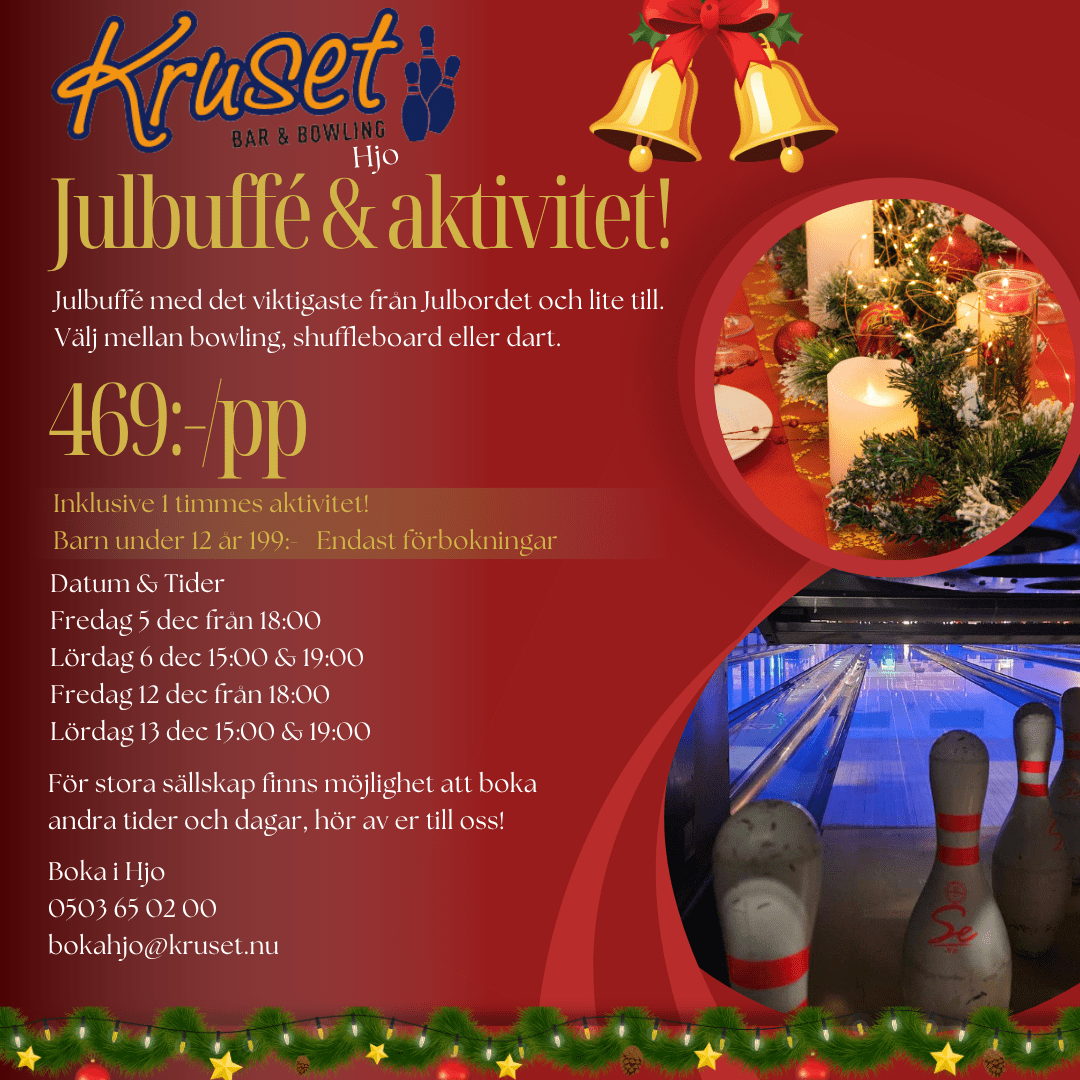 Välkommen att fira in julen hos oss på Kruset Bar & Bowling i Hjo – med god mat, härlig stämning och roliga aktiviteter!